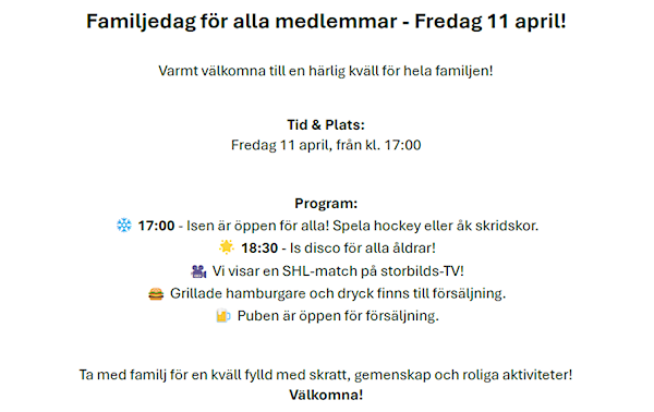 - 17:00 - Isen är öppen för alla! Spela hockey eller åk skridskor.