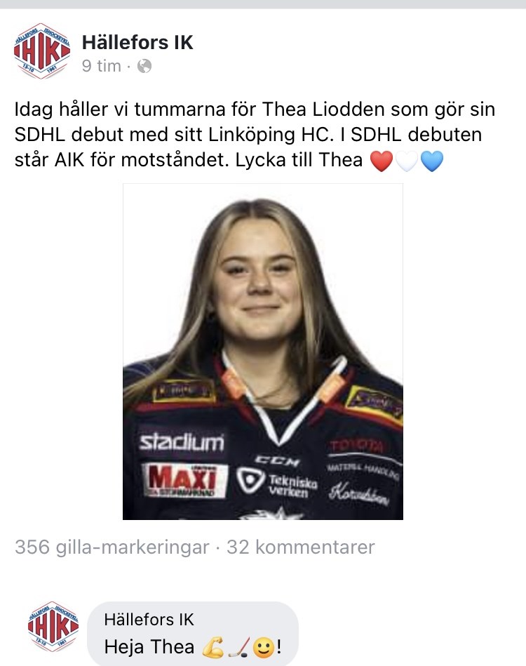I dagens match mellan Linköping HC och AiK i SDHL gjorde Thea Liodden debut. Matchen vanns av LHC med 2-1 och Thea gjorde en bra insats. Hon är därmed den 8:e HIK fostrade tjejen som spelar i SDHL. Lycka till framöver säger vi från Hällefors IK s damlag. DamJuniorer 30 jan 2022 0kommentarer