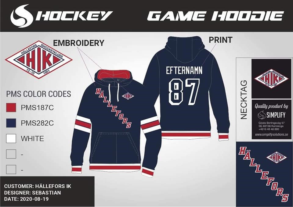 Provstegen för nya hoodies och t-shirts finns kvar denna vecka. Priser: Hoddie Vuxen 449:- Barn 349:- Namn 100:- T-Shirt Vuxen 149:- Barn 129:- Namn 50:- Ni kan prova och beställa t.om. fredag. Provstegen finns under disken i cafeterian. Både t-shirts och hoodies. Prata med ledare för laget, så det går att samordna. Beställningslistor ligger på ett bord. Leveranstiden är 4 veckor , De som väljer att beställa senare betalar frakt och beställer direkt av Simplify. Det kommer då inte att kunna beställas genom HIK. Passa på nu, för av erfarenhet kommer många ångrar sig i efterhand!