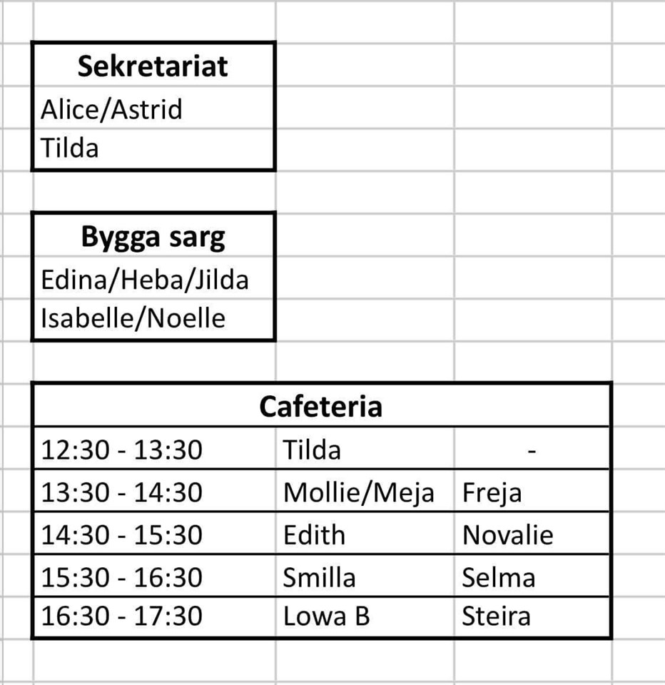Eftersom matchen i helgen är flyttad från söndag till lördag så lägger jag ut vilka som har lite tjänstgöring redan nu ifall nån måste byta bort sitt pass. Klocka: Engla/Emil Speaker: Alvin Protokoll: Wille Bås: Wilmer Bås: Sebastian Cafeteria: Jakob Cafeteria: Alice U18 16 nov 2021 0kommentarer