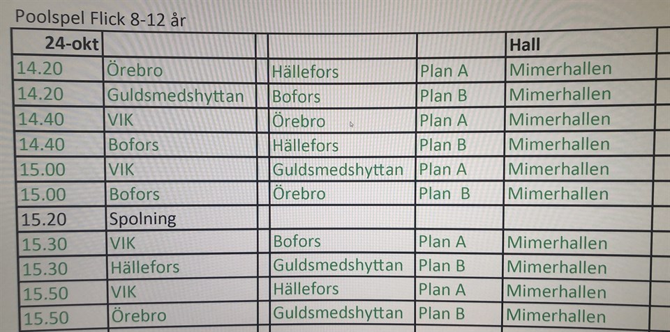 Hej Är poolspel på söndag i Västerås. Vi ska åka buss tillsammans med U13 killarna som ska spela match samtidigt. Poolspelet spelas 4 mot 4 på halvplan med 1,5 min tutbyten så för att det ska bli bra med speltid så åker vi med 12 utespelare + målvakt. Alla som är intresserade kan anmäla sig, senast på torsdag, så kommer vi ta ut ett lag. Målet är att alla ska få spela lika många poolspel så får man inte vara med denna gång får man vara med vid nästa tillfälle.