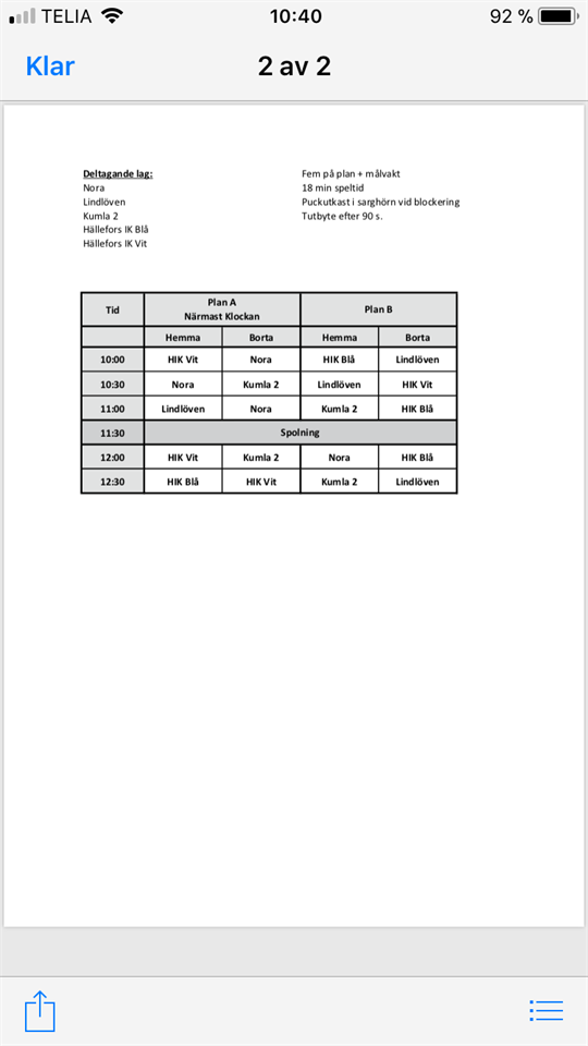 Träningar v 9 Måndag 19/2 kl 17.30-18.30 Fredag 23/2 kl 17.15-18.30 Vet inte hur många gånger jag skrivit att det är sista poolspelet på hemmaplan men nu ska det vara sista :) Alltså poolspel i Hällefors söndag 25/2. Samling 08.50. Anmäl som vanligt vilka barn som ska vara med. Det behövs ju även en sista hjälpande hand av er föräldrar. Sargbygge, sekretariat och cafeteria behövs bemannas. Vet man med sig att man inte stått i cafeterian innan så kan man ju kanske ta det denna gång? U18 17 feb 2018 5kommentarer