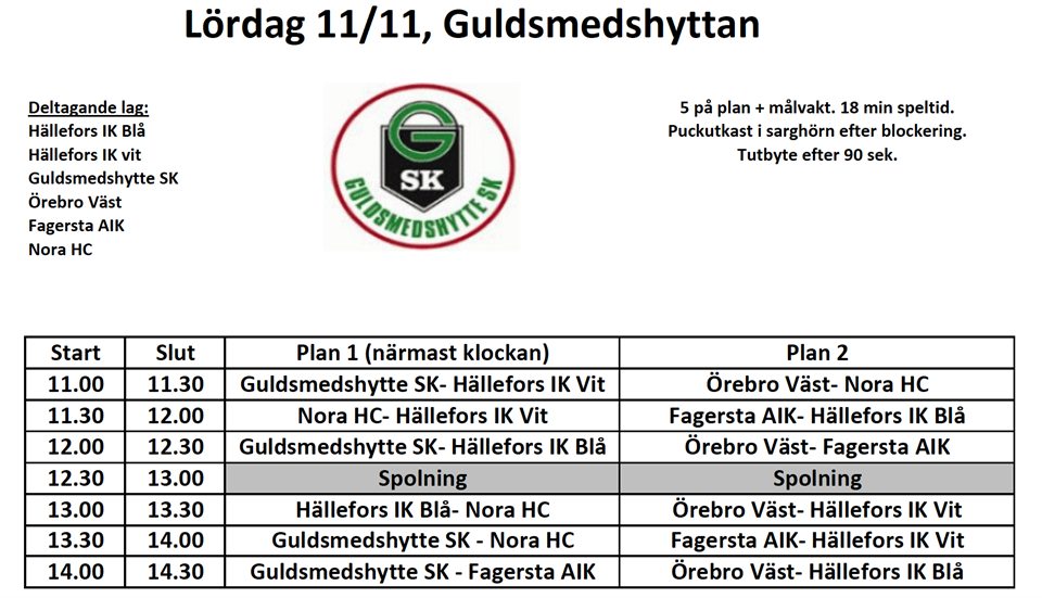 Lördag 11/11 är det poolspel i Guldsmedshyttan. Samling 08:45 vid Hällevi eller 10:00 vid Rosshallen i Guldsmedshyttan. Första matchen börjar 11:00. Meddela om Ni ska med eller ej och om Ni åker direkt eller kommer till Hällevi på laget eller via Facebook. /Ledarna U18 5 nov 2017 0kommentarer